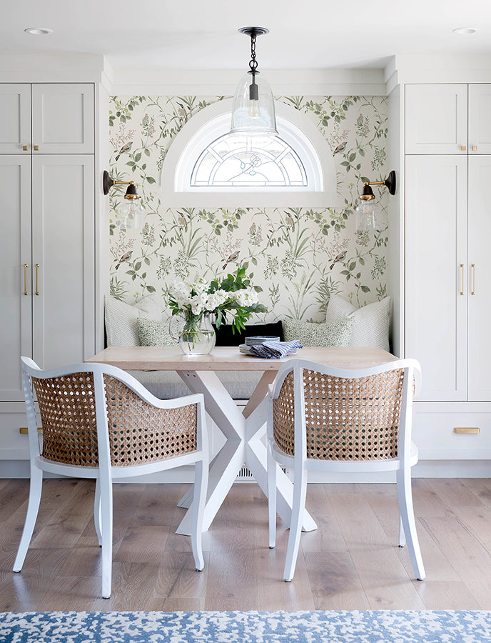 Charming and utterly timeless, this botanical design features delicate pink and light blue songbirds perched on twining green vines laden with ripe pink and light green berries.
